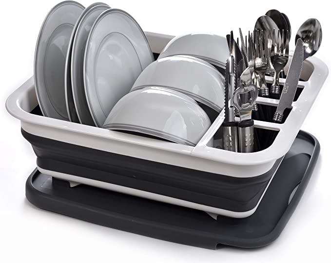 Collapsible Dish Drying Rack – Popup and Collapse for Easy Storage, Drain Water Directly into the Sink, Room for Eight Large Plates, Sectional Cutlery and Utensil Compartment, Compact and Portable.