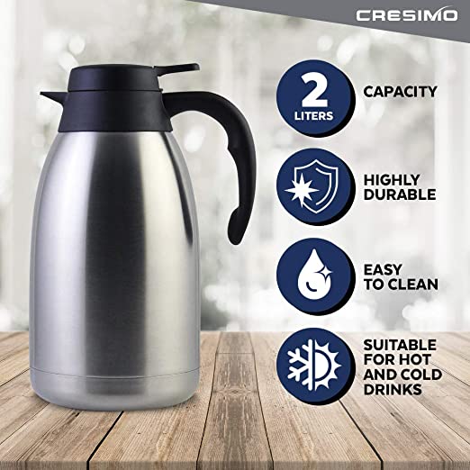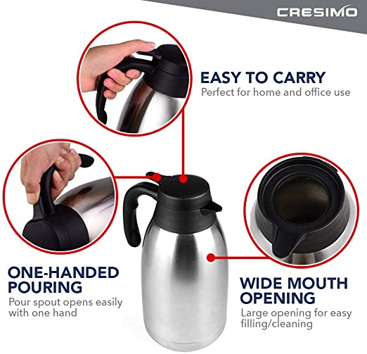 Cresimo 68 Oz Stainless Steel Thermal Coffee Carafe / Double Walled Vacuum Flask / 12 Hour Heat Retention / 2 Liter Tea, Water, and Coffee Dispenser