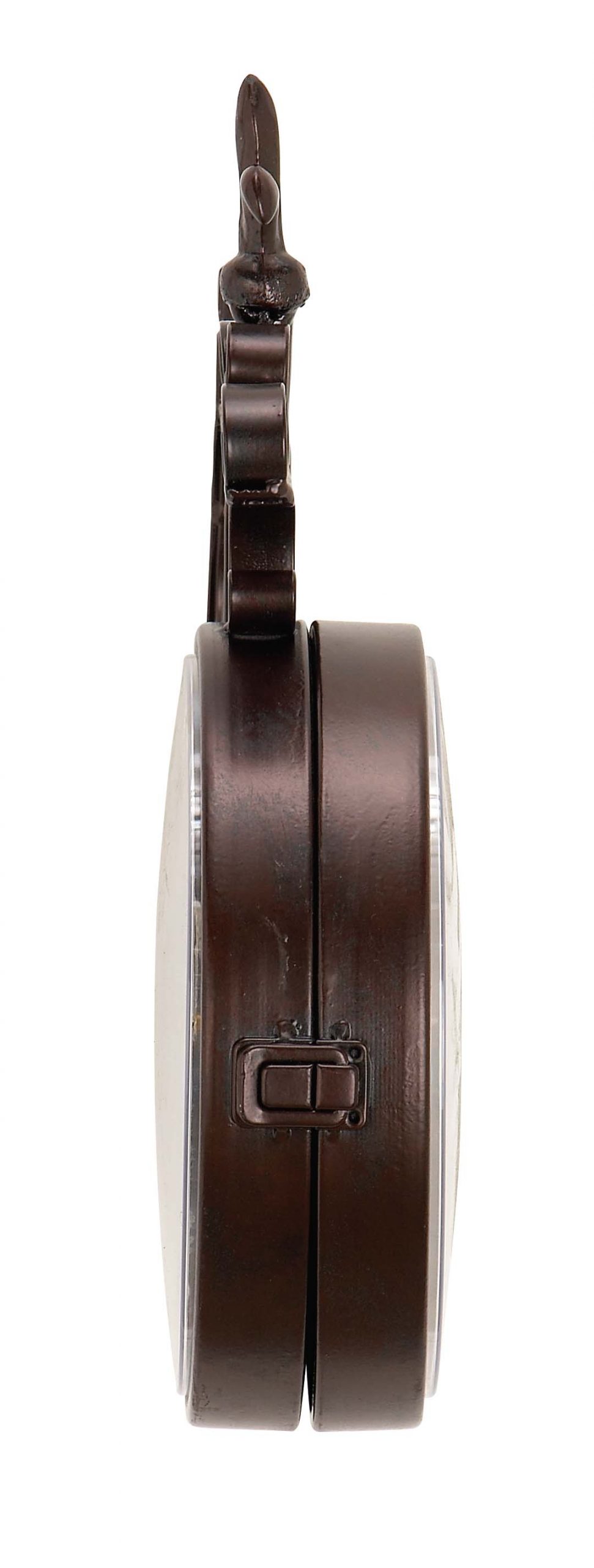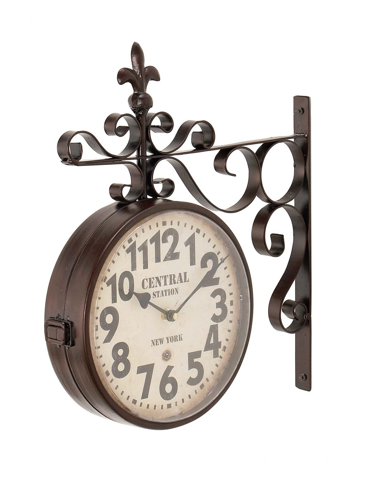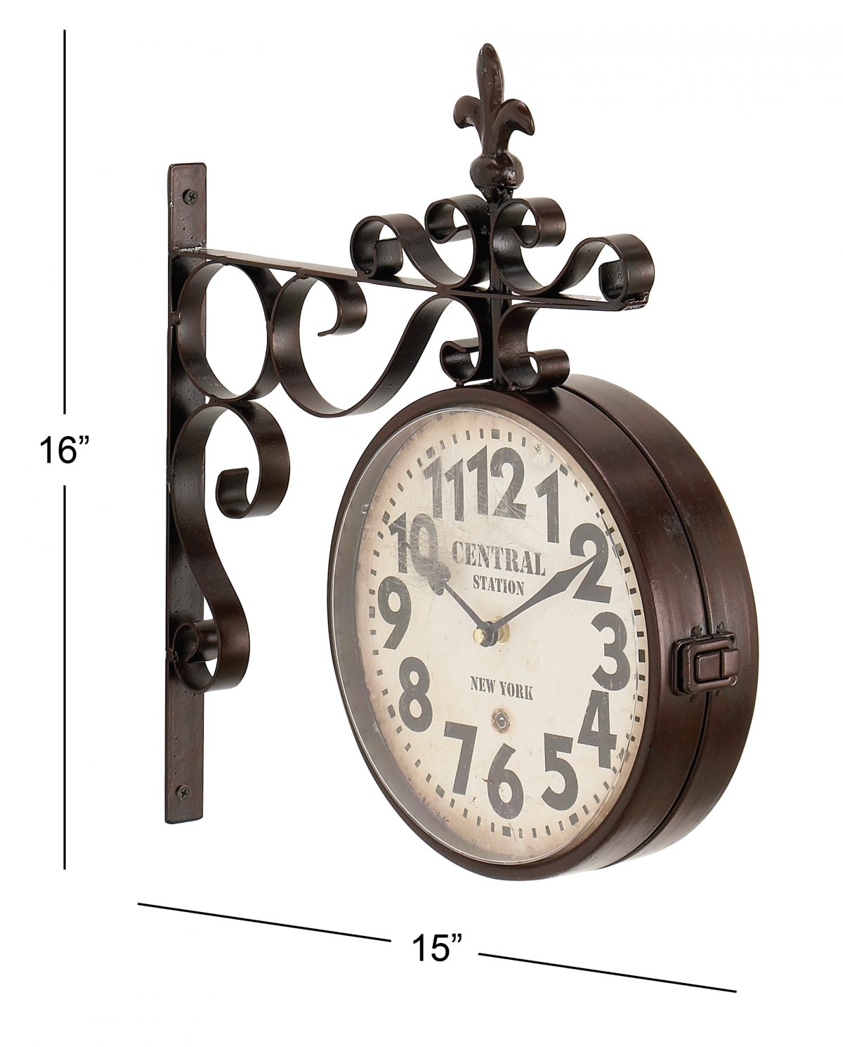 16″ x 15″ Rustic Elegance black iron round double sided wall clock, white clock face with rust brown highlights, black numerals, black clock hands, and black “Central Station New York” typography, round iron metal frame, L-shaped iron band wall mount with scrolled iron bands and fleur-de-lis finial, distressed finish