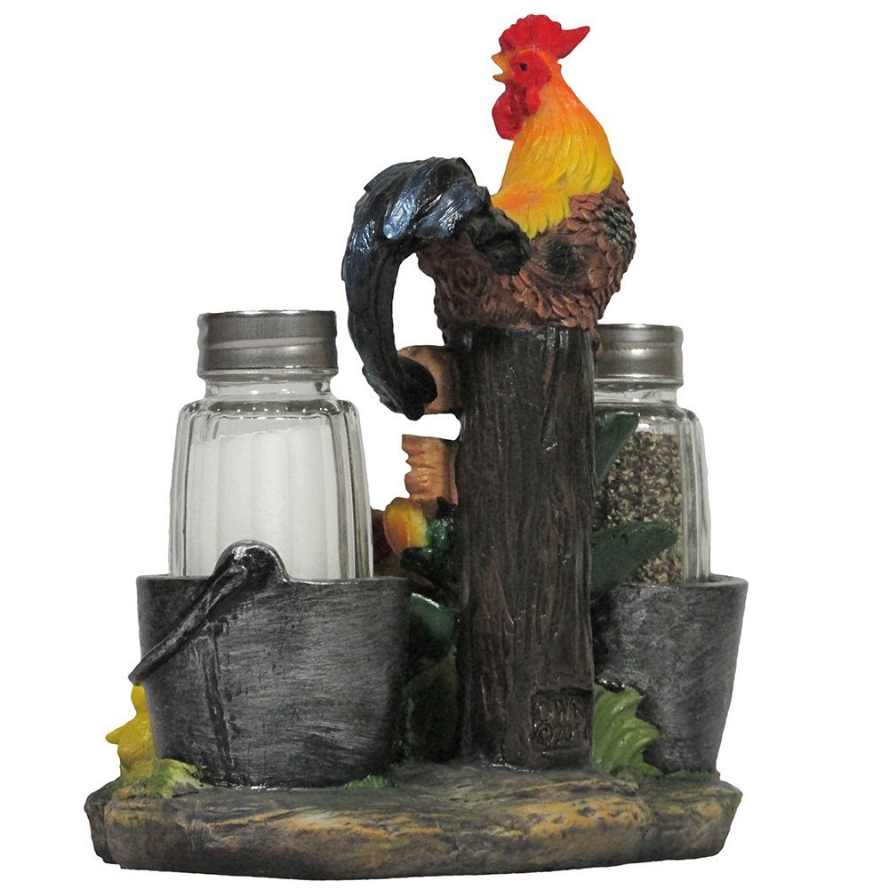 With their adorable little chicks in tow, a protective mother hen makes her rounds around the milk pails, while a crowing rooster watches over them in this rustic country salt and pepper shaker set. A finely detailed figurine that features two glass salt and pepper shakers that sit in vintage stainless steel look milk pails and is accented with sunflowers and rustic faux wood signs that point to the seasonings. A classic storybook image of farm life that will add a dose of country style and sunshine to your farm theme kitchen décor! 3-piece set includes one salt and pepper shaker figurine that is the display stand and holder of 2 glass salt and peppers shakers.
