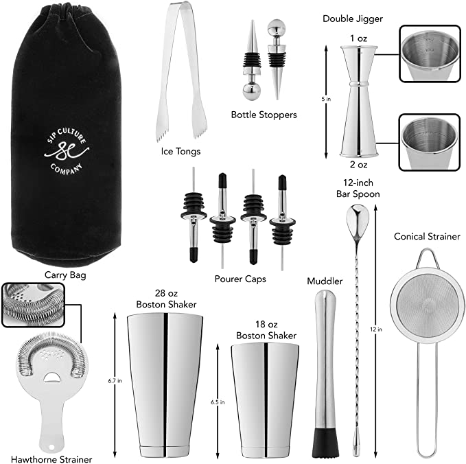 • ESSENTIALS INCLUDED IN THIS 16-PIECE COCKTAIL KIT – 18 oz & 28 oz weighted Boston shaker tins, hawthorne strainer with welded high density spring, conical fine mesh strainer, 12-inch spiral bar spoon, tongs, Japanese double jigger (with marked measurements for 1/2 oz, 3/4 oz, 1 oz, 1 1/2 oz, and 2 oz.), muddler, 4 pourers with caps, 2 bottle stoppers, an illustrated book of 30 delicious cocktail recipes, and a velvety soft reusable bag to protect your tools while storing or traveling with them.
