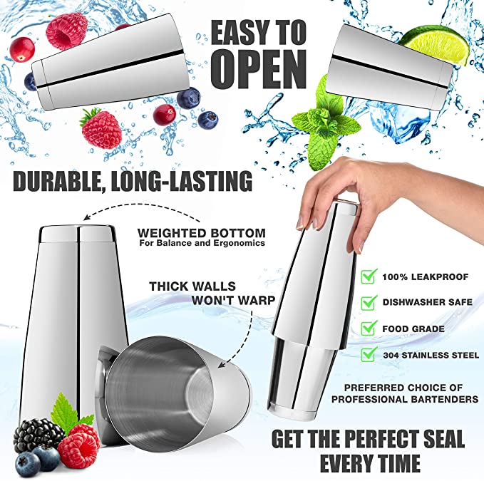 • EASY-OPEN, NO-LEAK SHAKER TINS – There’s nothing worse than a watered-down martini! The size, weight, and thickness of this drink shaker is the preferred choice of professional bartenders because it forms the perfect water-tight seal when chilled, so you never have to worry about leaks or embarrassing yourself trying to get it open. It has the durability to perform in high volume bars, yet is user-friendly enough to be the perfect beginner bartending kit.