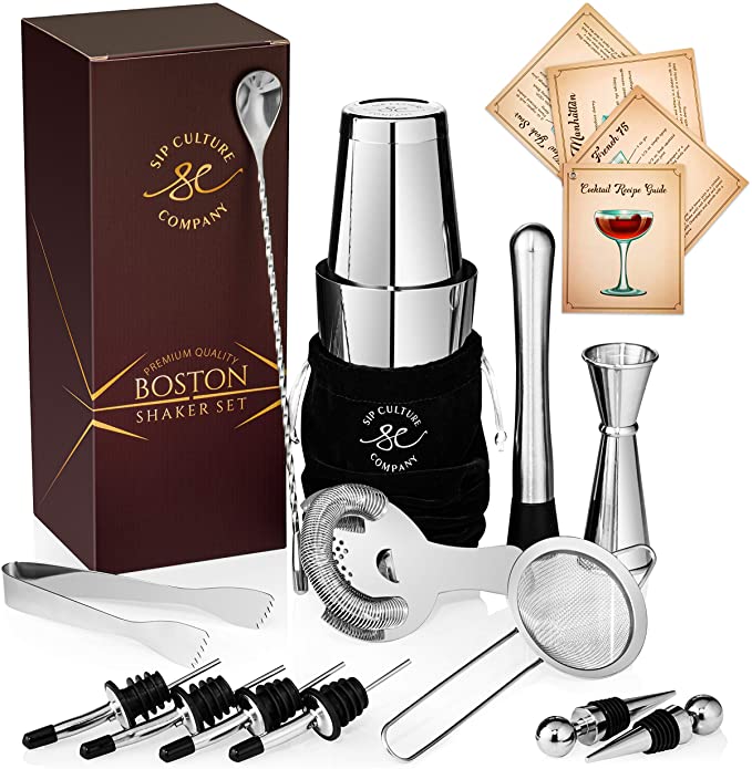 Sip Culture Boston Shaker Mixology Bartender Kit – Premium Stainless Steel Cocktail Shaker Set and Carry Bag: Dishwasher Safe, Easy-Open Drink Shaker with Bar Tools + Recipe Guide for Mixer Bartending