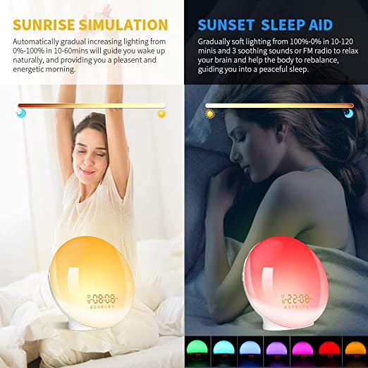 • ????【 Wake Up Sunrise Alarm Clock】Sunrise simulation, similar to a sunrise, the wake-up light gradually changes the color and brightness from dark red to bright yellow before the alarm clock goes off. The upgraded wake up light includes more features, you can set the lighting time, lighting brightness and alarm volume. More user-friendly for your different needs.
